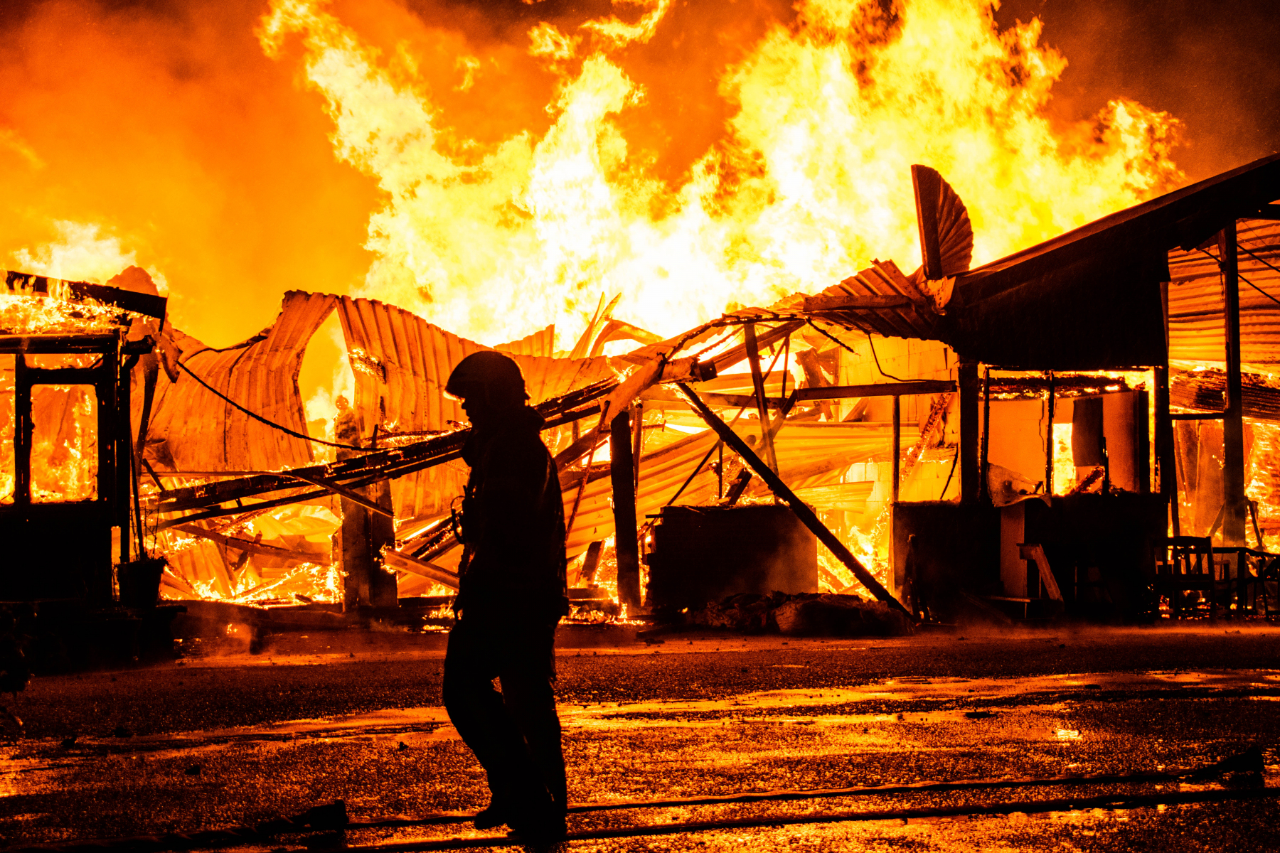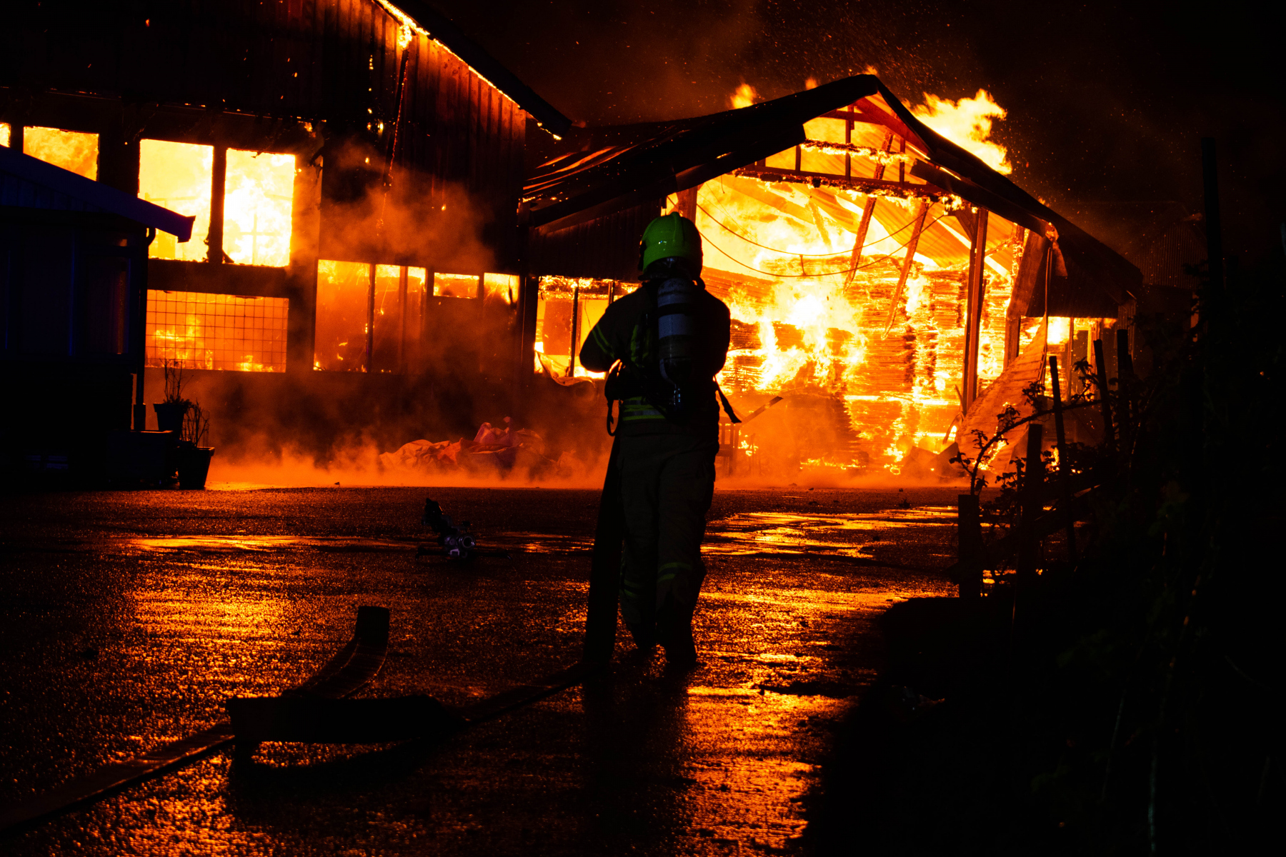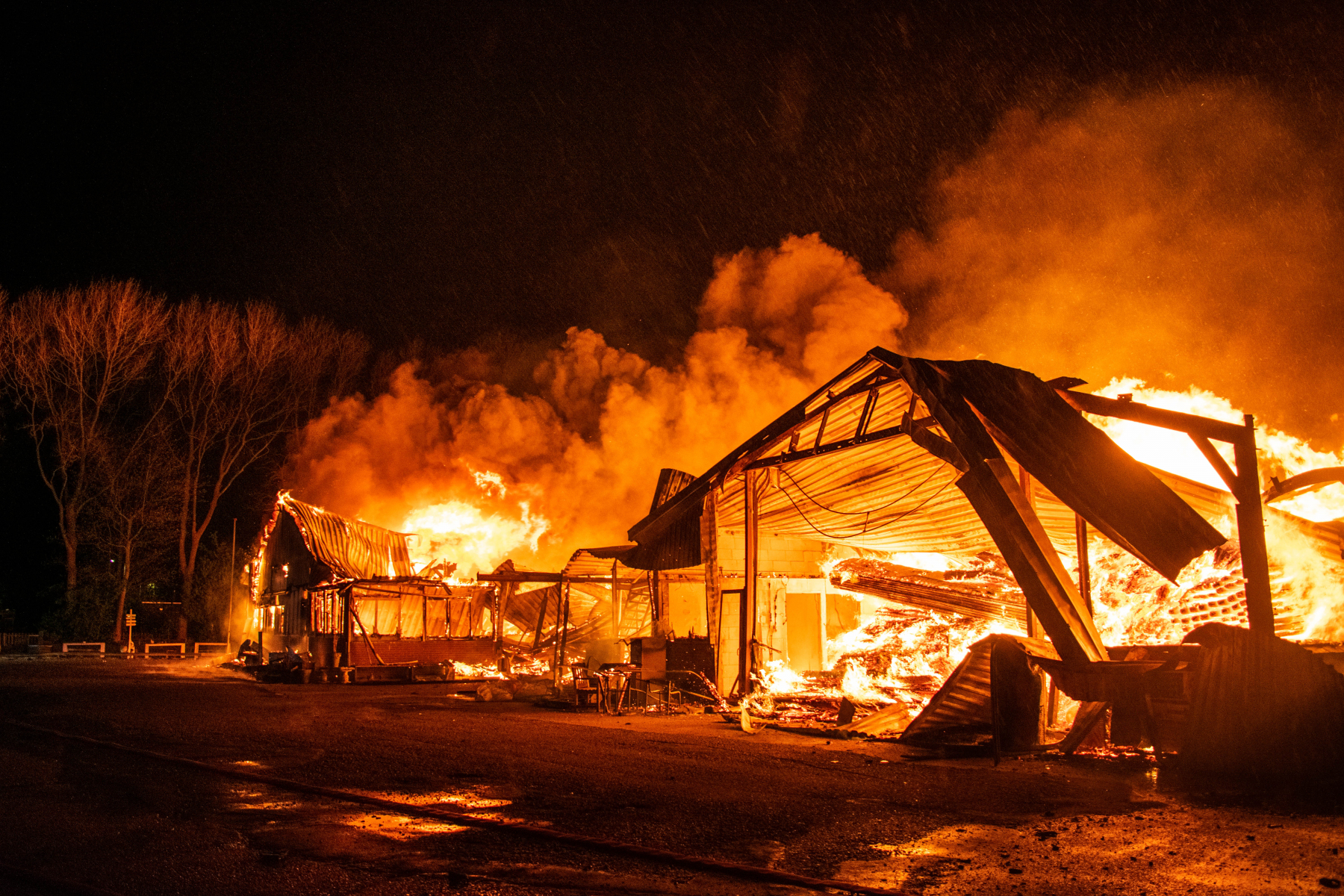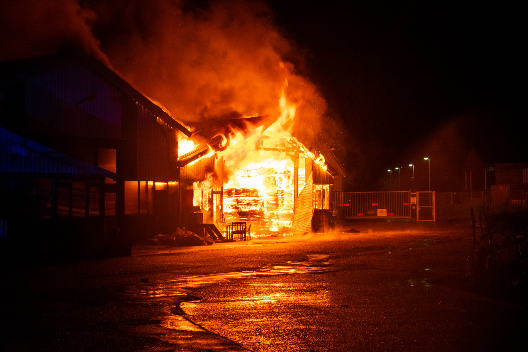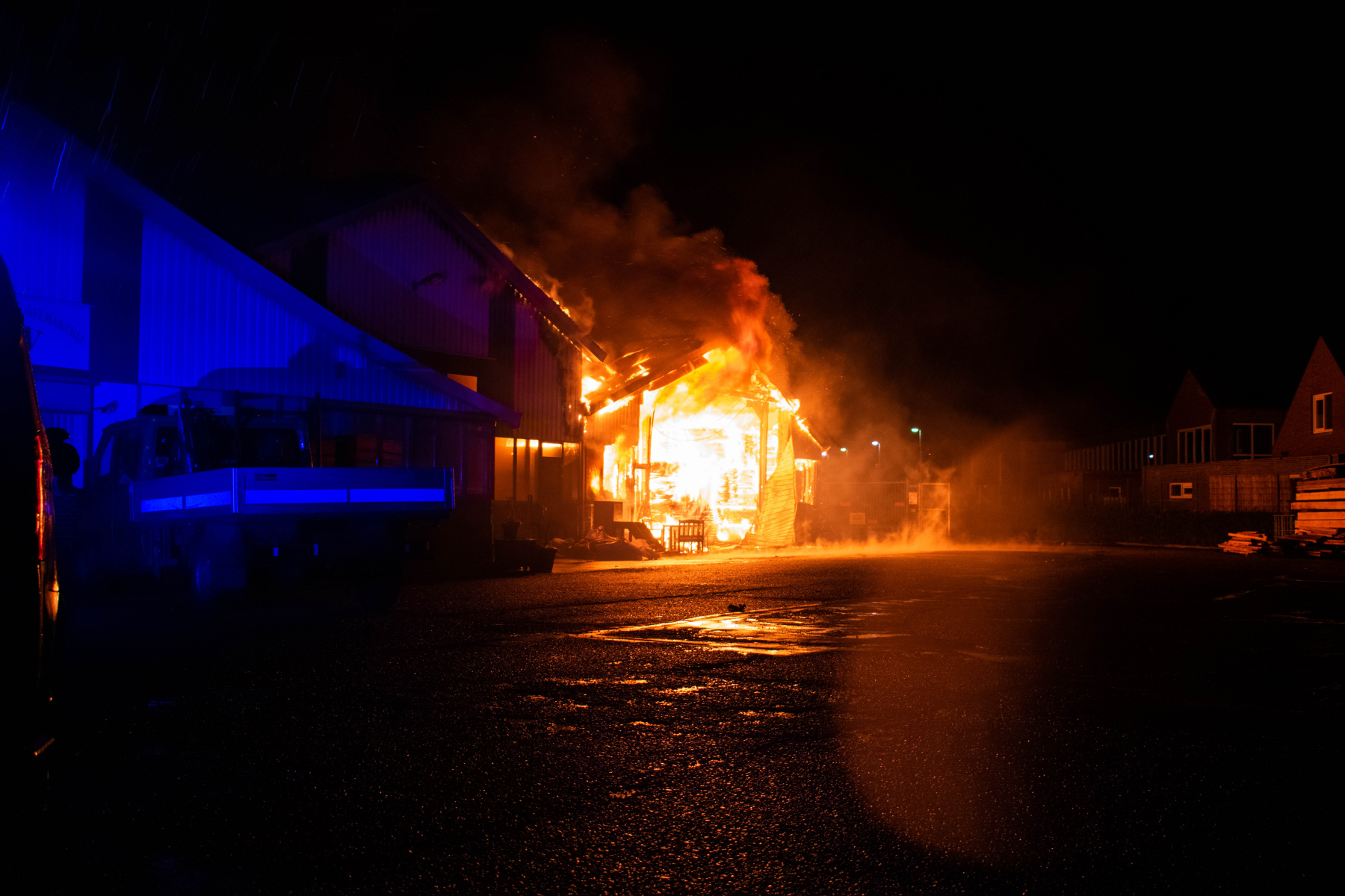 De brand is begonnen in de rechter loods waarin hout was opgeslagen. Al snel sloeg het vuur over naar de naastgelegen loods. Na nog geen 10 minuten sloegen de vlammen al metershoog de lucht in.