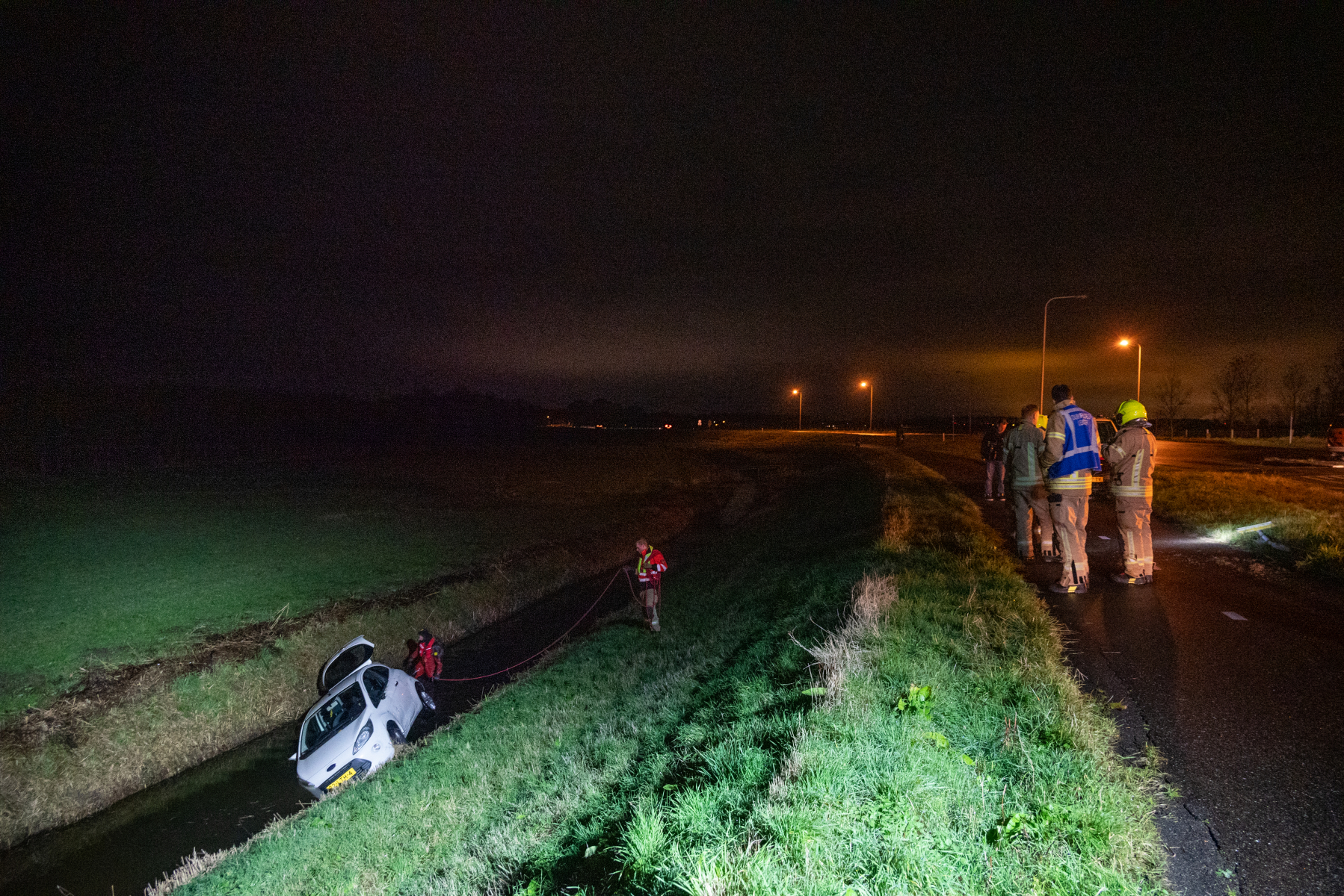 Simonshaven - De hulpdiensten zijn vannacht groot uitgerukt voor een voertuig te water aan de Molendijk in Simonshaven. Voorbijgangers hebben een auto in de sloot zien liggen zonder persoon erbij.